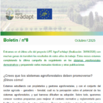 - Octavo boletín semestral (octubre 2025) en líneaYa está disponible la octava edición del boletín semestral AgroForAdapt. En este número presentamos el cuestionario sobre cómo mejorar las políticas y normativa que afectan a los sistemas agroforestales; presentamos el seminario y viaje técnico realizados en Castilla y León en junio de 2025; las comunicaciones del proyecto en el 9º Congreso Forestal Español; el Itinerario agroforestal auto-guiado en... Lee más: Octavo boletín semestral (octubre 2025) en línea