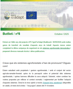 Ja està disponible la vuitena edició del butlletí semestral AgroForAdapt. En aquest número presentem el qüestionari sobre com millorar les polítiques i normativa que afecten els sistemes agroforestals; presentem el seminari i viatge tècnic realitzats a Castella i Lleó al juny de 2025; les comunicacions del projecte en el 9è Congrés Forestal Espanyol; l'Itinerari agroforestal auto-guiat en Camps i Armet (Monells) i […]